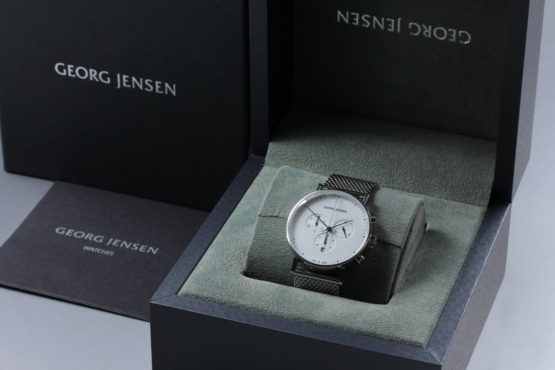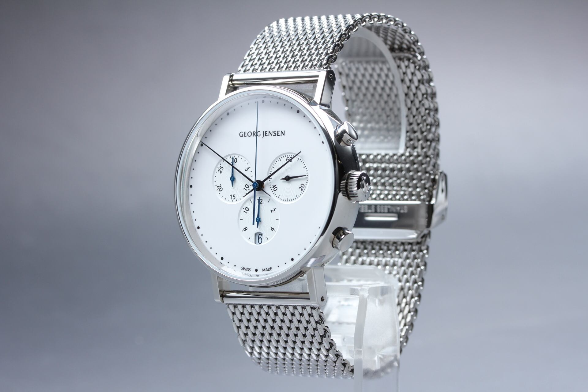 [w/Box, Paper ] Georg Jensen Koppel 317 White Chronograph Qz SS Swiss Made Watch