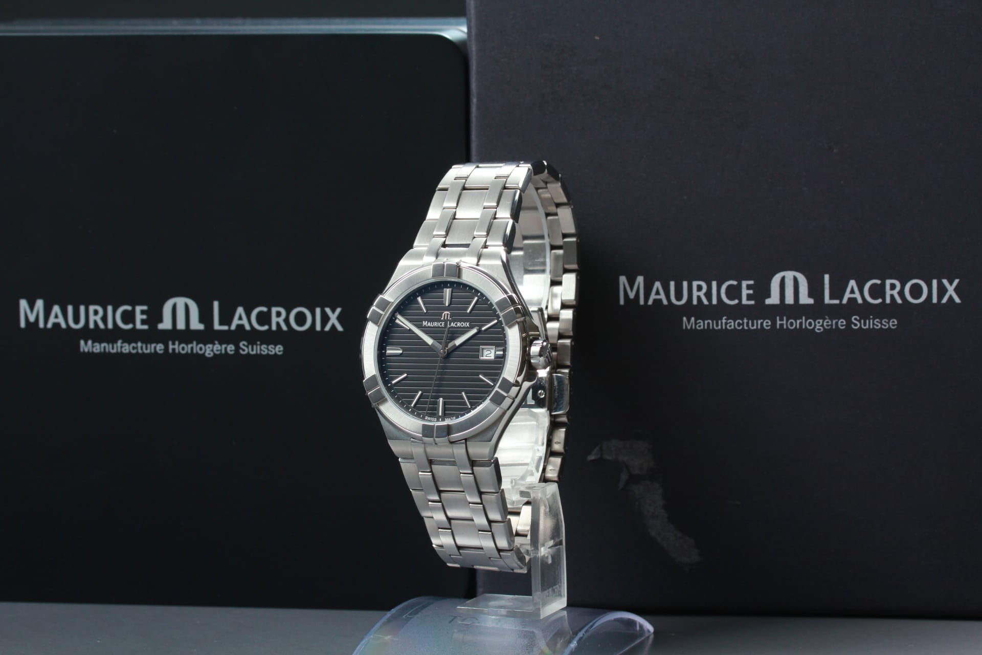 Maurice Lacroix Aikon AI1008 Black SS Date Quartz Swiss Made Watch [Box Damaged]